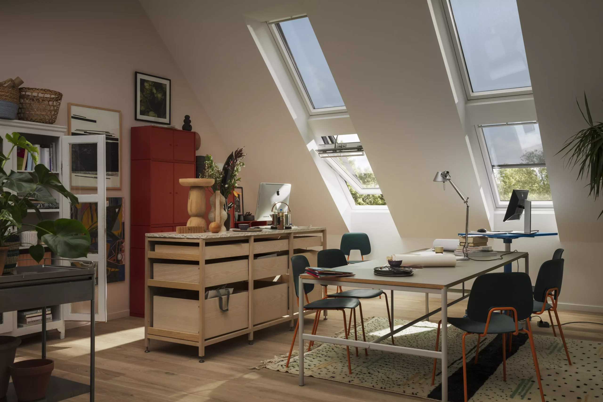 Of je nu de hele dag thuis werkt of ‘s middags gasten ontvangt; met een VELUX buitenzonwering blijft je huis koel. Een handbediende VELUX buitenzonwering is zeer geschikt voor dakramen binnen handbereik, terwijl de elektrische en zonne-energie aangedreven buitenzonwering wordt bediend met een kant-en-klare wandschakelaar of met het VELUX App Control systeem, die optioneel verkrijgbaar is in de webshop.