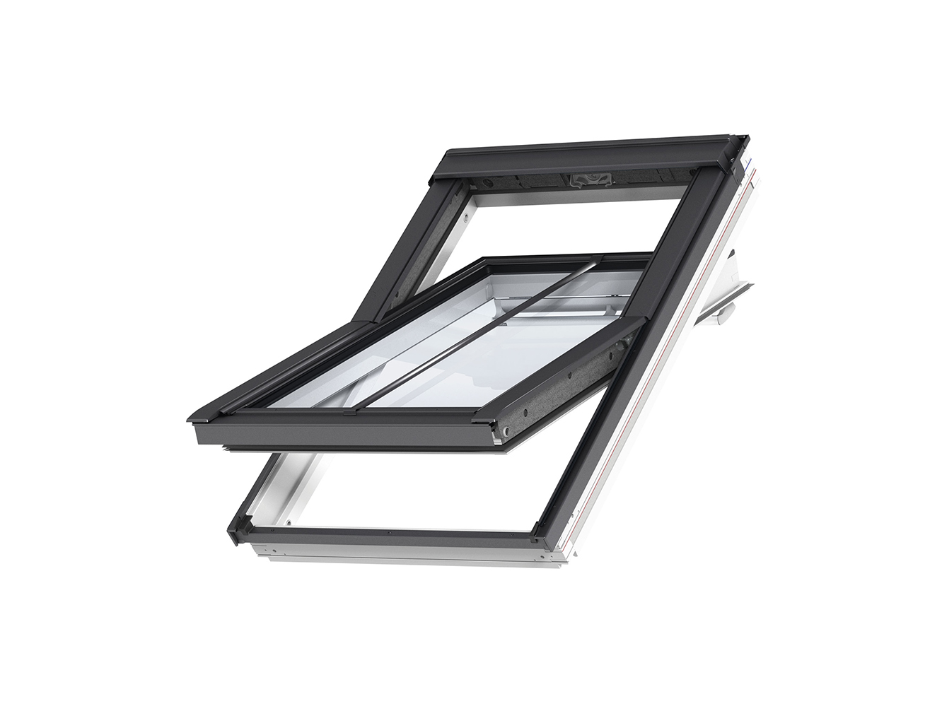Het bovenraam van het balkon is een aan de onderzijde bediend uitzettuimelvenster dat naar buiten toe opent voor een onbelemmerd panoramisch uitzicht. Wanneer het bovenraam is geopend, kan het benedenraam naar buiten worden gedraaid tot een verticale positie. Bij het openen van het benedenraam zijn de ingebouwde balustrades aan de zijkant aan beide zijden opgeheven. Om optimaal van het balkon te kunnen profiteren, raden we een installatiehoogte aan die een duidelijke zichtlijn naar buiten mogelijk maakt, of je nu staat of zit.