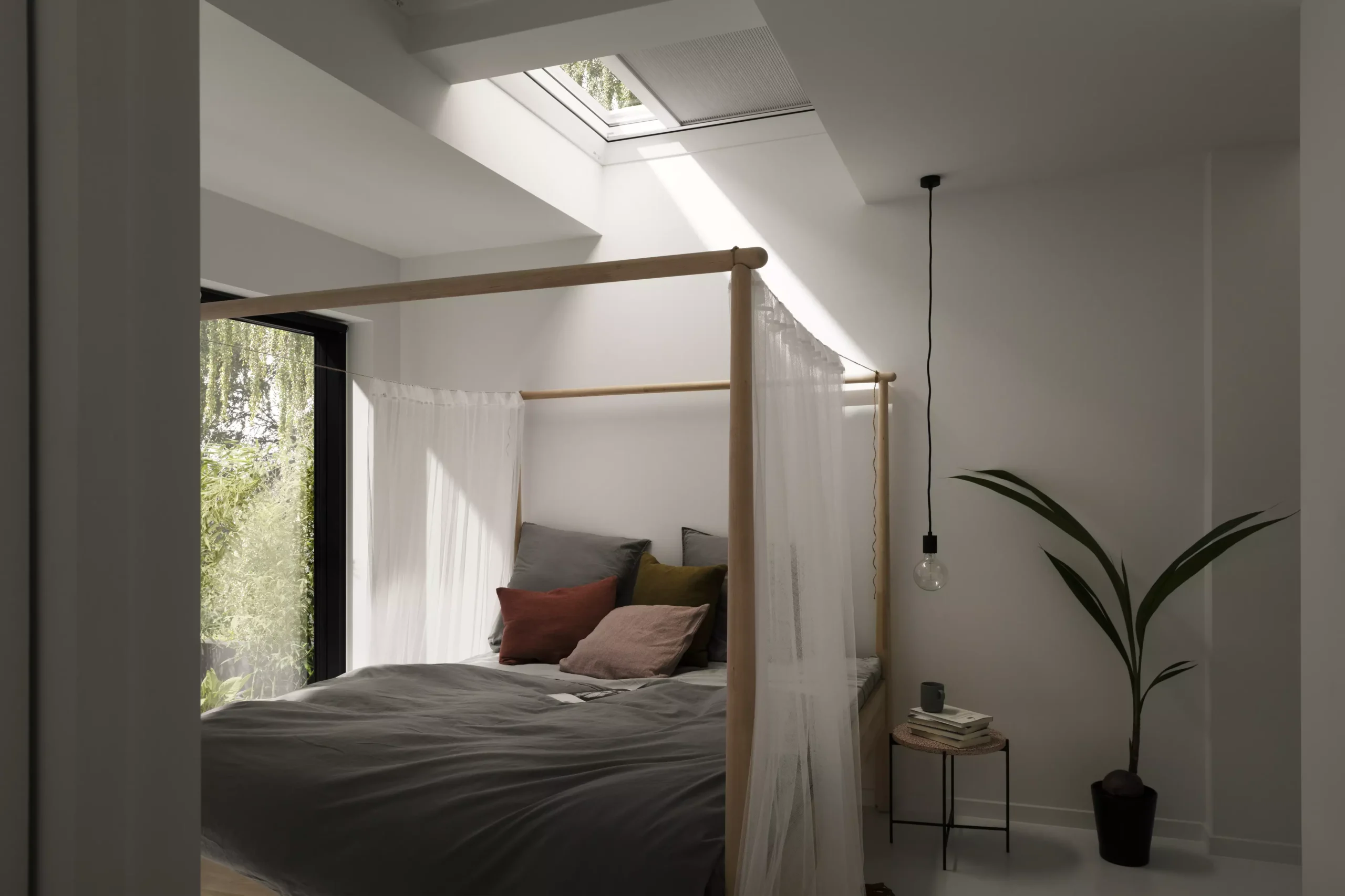 Het VELUX verduisterend plisségordijn voor VELUX lichtkoepels verduistert de kamer en beschermt tegen kou, waardoor het ideaal is voor slaapkamers, home cinema’s of andere ruimtes waar totale verduistering gewenst is. Het verduisterende materiaal blokkeert effectief het zonlicht en zorgt voor een optimale nachtrust of een perfecte omgeving voor het bekijken van films.